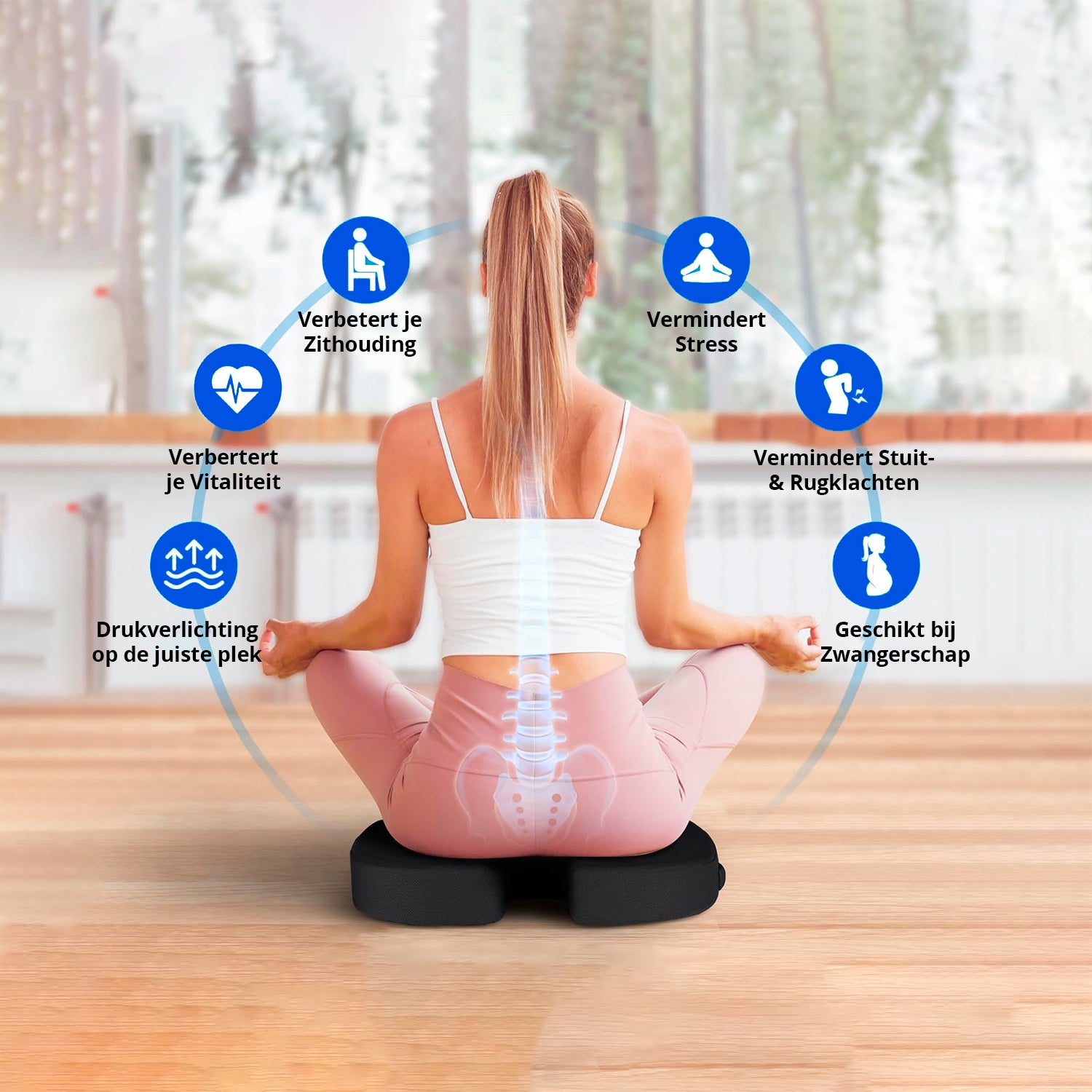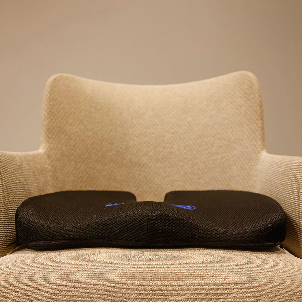 Een ergonomisch zitkussen met uitsparing vermindert de druk op je stuitje doordat het stuitbeen vrij blijft van contact met het zitvlak. Daarnaast zorgt het kussen voor een betere houding van je bekken, waardoor ook je onderrug minder wordt belast. Dit kan zorgen voor: minder pijn en meer comfort, zelfs bij lang zitten.