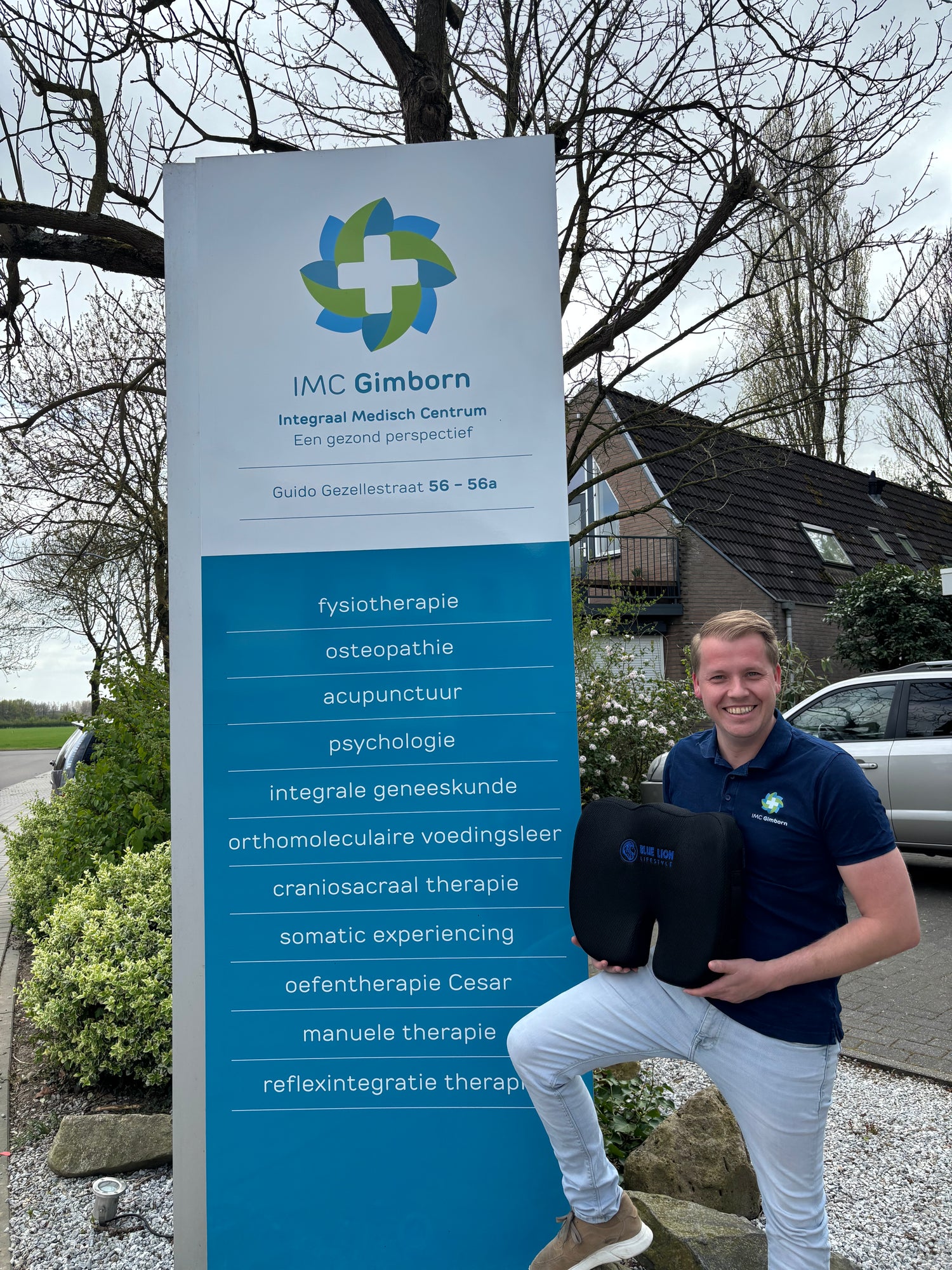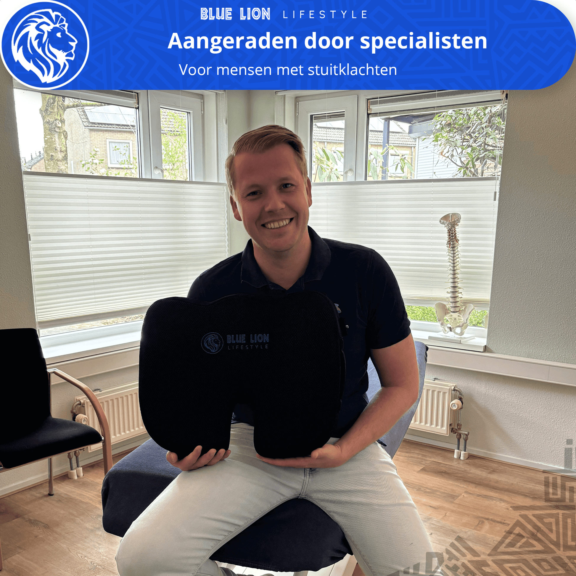 Jouw Blue Lion zitkussen biedt drukverlichting die verlichting kan geven bij rugklachten zoals hernia of ischias.