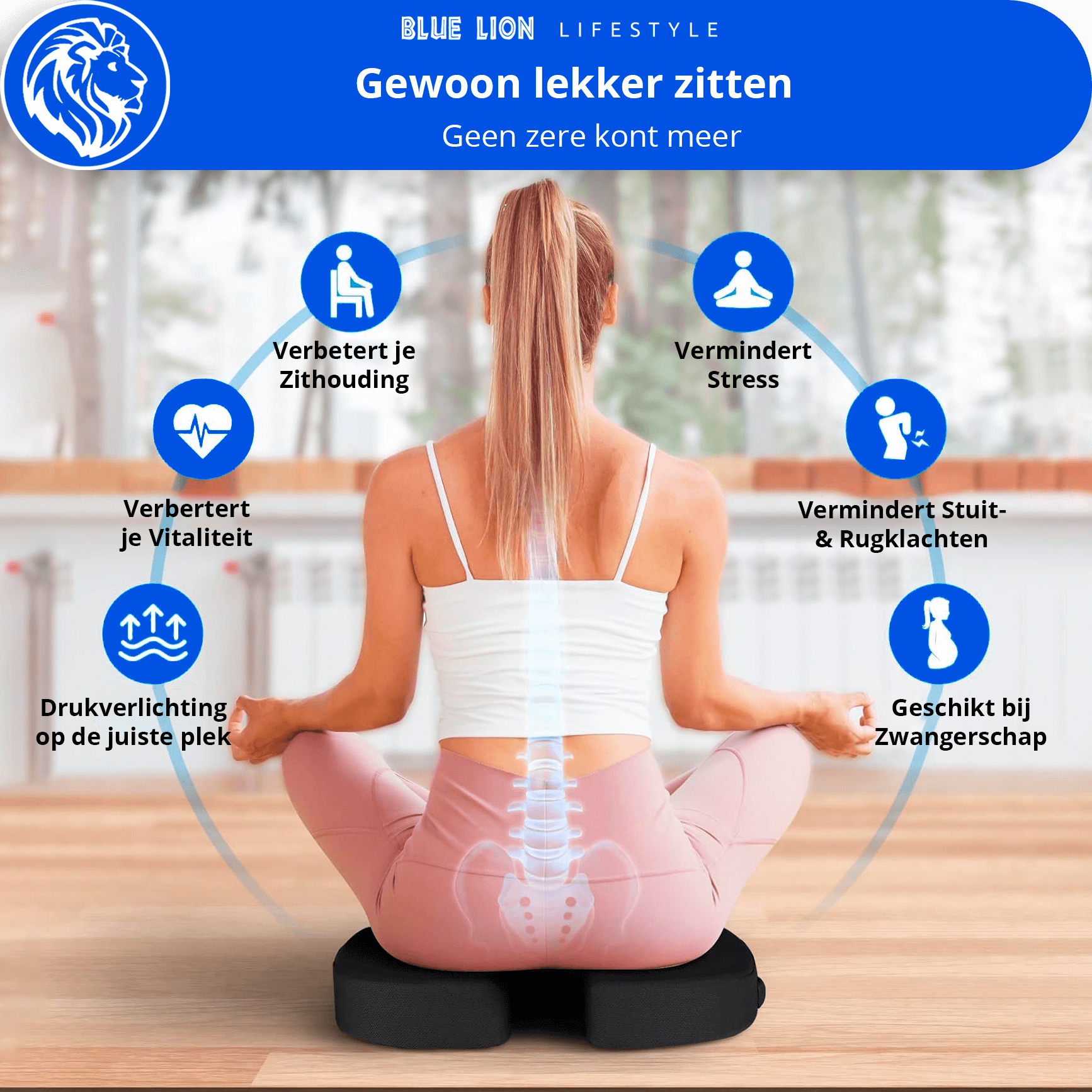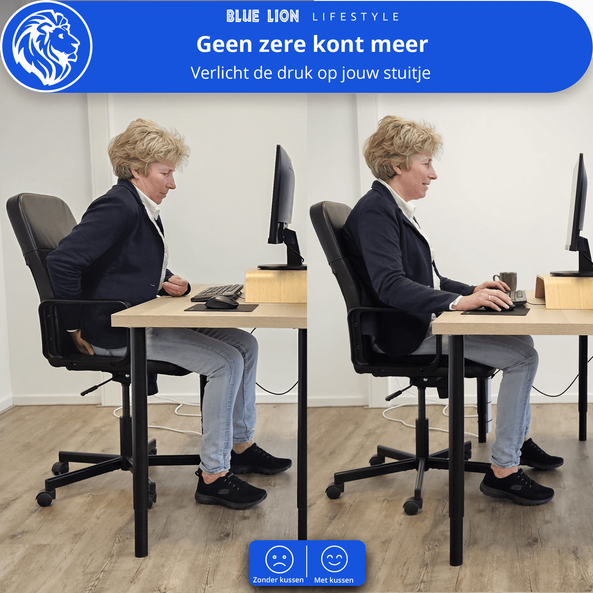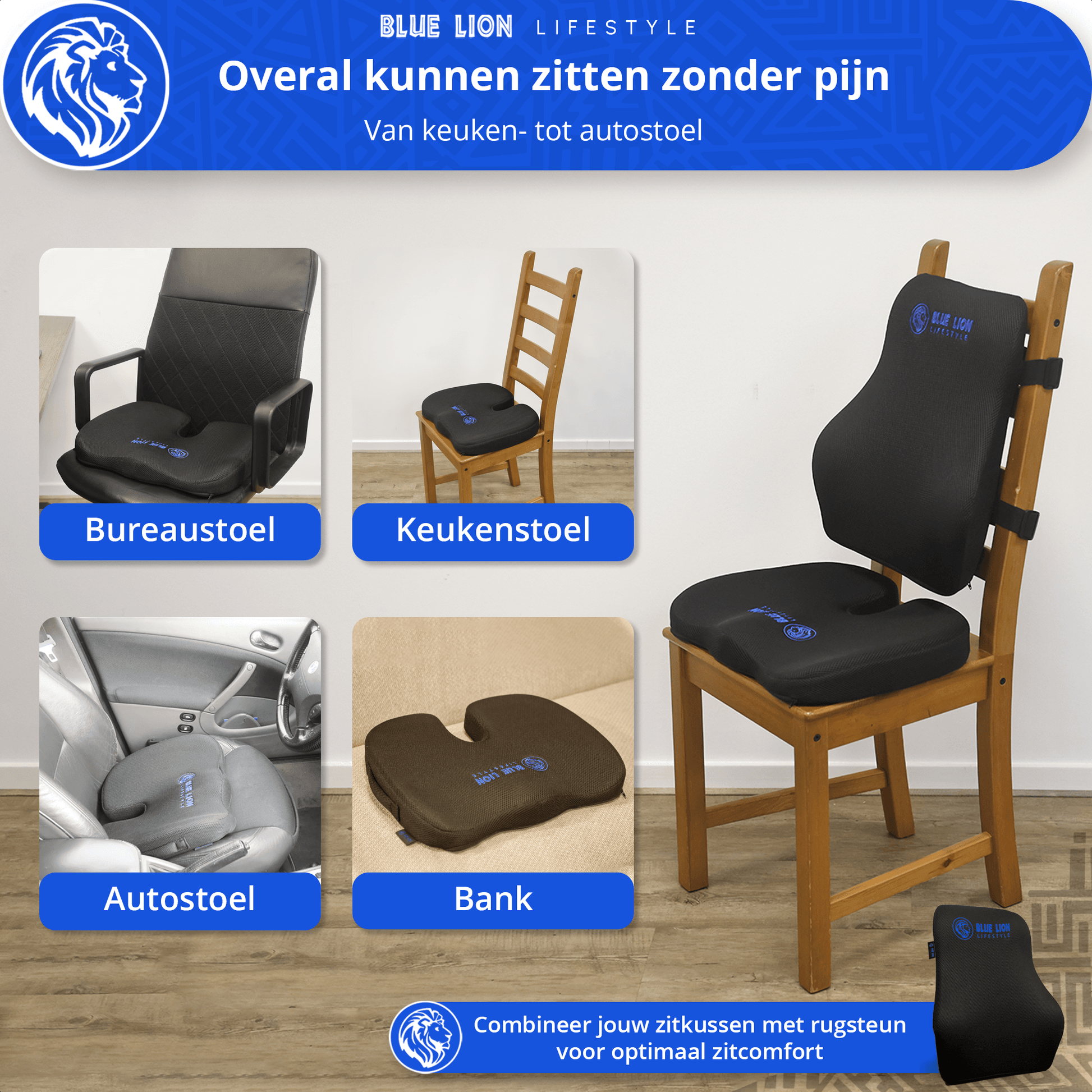 Zeker. Jouw Blue Lion zitkussen is geschikt voor bureaustoelen, autostoelen, keukenstoelen en meer.