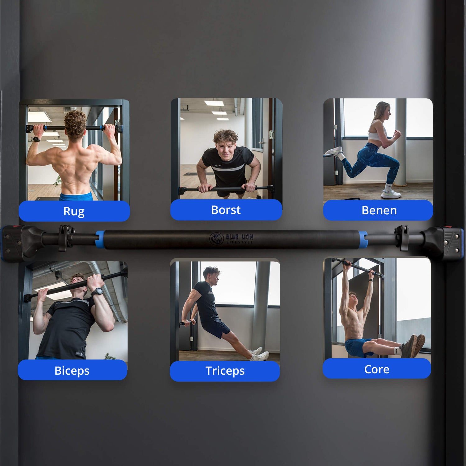 Gebruik de stang voor pull-ups, core-oefeningen of stretch-routines. Met de MAX-2 (inclusief powerband) voeg je nog meer variatie toe zoals tricep extensions, rows of assisted pull-ups. Zo train je je hele lichaam gewoon vanuit huis.